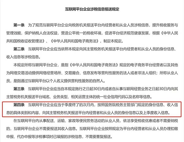 近日,《互聯(lián)網(wǎng)平臺企業(yè)涉稅信息報送規(guī)定》正式出臺實施,一石激起千層浪,社會各界對此廣泛關(guān)注。那么,這項新規(guī)究竟藏著哪些變化?又將對哪些群體產(chǎn)生深遠影響?